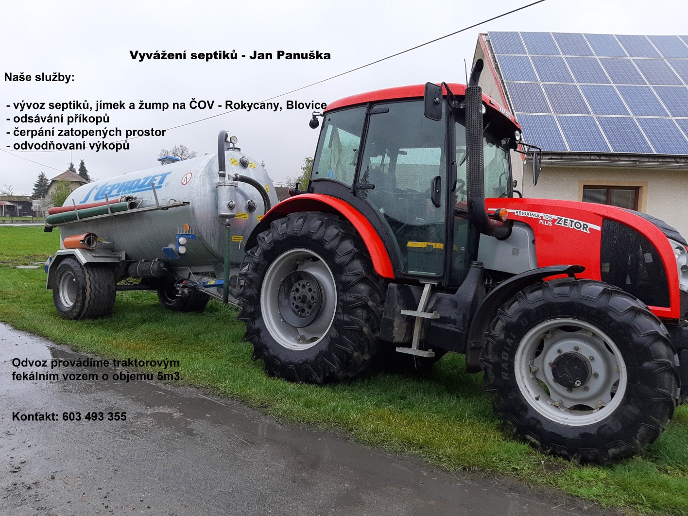 Traktorový fekální vůz o objemu 5 m3, nebo nákladní automobil o objemu 6,6 m3.